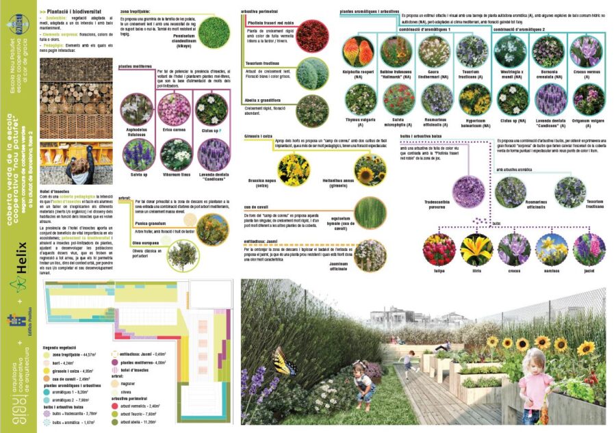 ARQUITOPIA ha comptat amb la col·laboració de Helix de Viver de Bell-lloc i el seu equip tècnic en la creació de la capa vegetal del projecte que estaven elaborant. Una proposta integrada en l’espai, sostenible, de baix consum energètic i d’aigua. El projecte, ara en fase de deliberació, permetrà a més generar llocs de treball per les nostres treballadores, implantant aquesta coberta vegetal al cor de Gràcia.